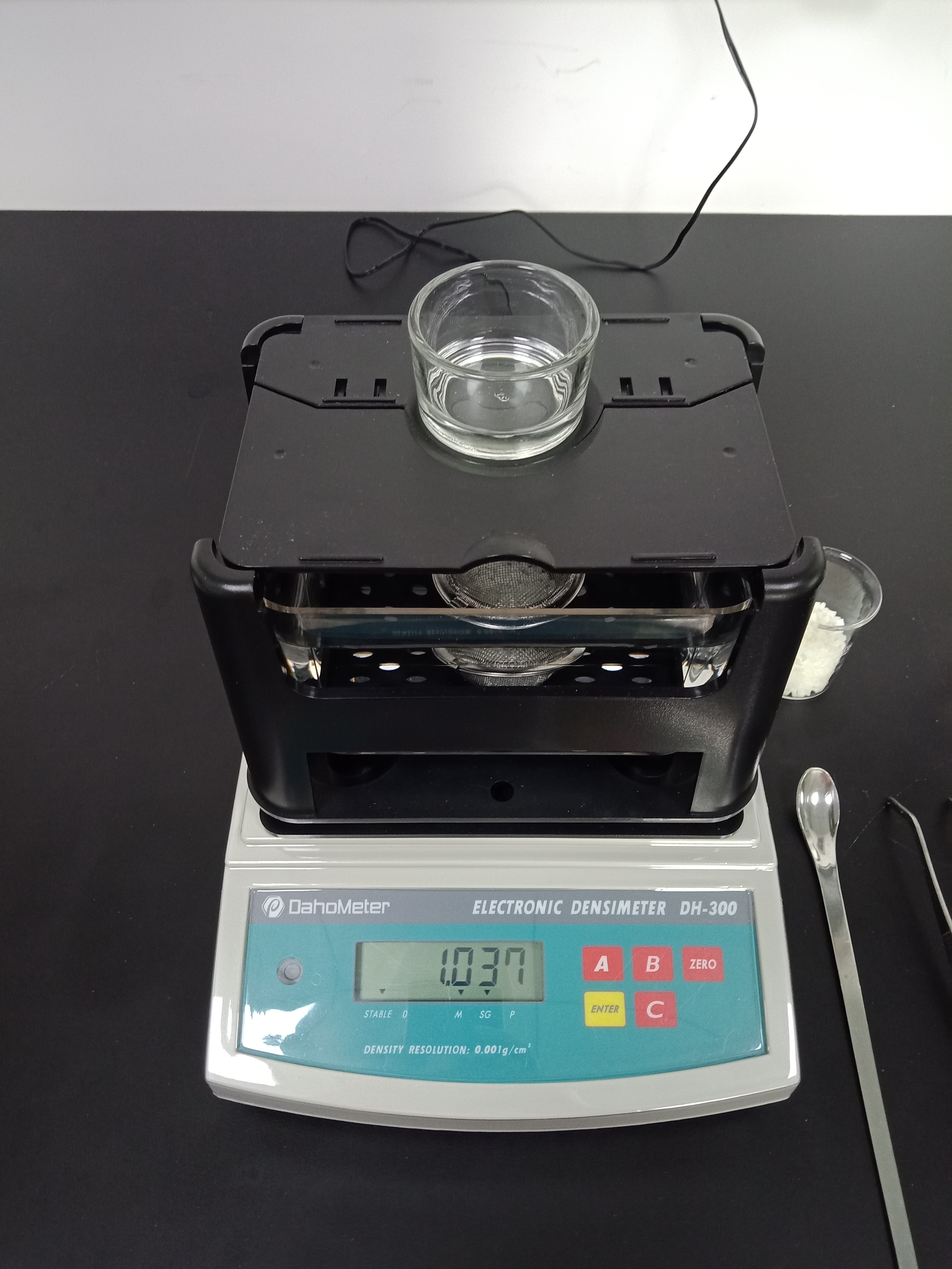 5,將裝有橡塑顆粒樣品的小網(wǎng)球放入酒精杯中浸潤3到5秒,期間搖晃幾下小網(wǎng)球,使得樣品能完全被酒精浸泡過(如圖1),再把裝有橡塑顆粒樣品的小網(wǎng)球放回水中吊籃上(如圖2),小玻璃杯放回測(cè)量臺(tái)上(如圖3)等待重量穩(wěn)定后(如圖3屏幕顯示0.17g),按【ENTER】鍵,儀器記錄樣品水中重量后,會(huì)自動(dòng)計(jì)算密度值,計(jì)算結(jié)束后會(huì)將計(jì)算結(jié)果顯示在屏幕中,如圖4屏幕顯示(1.037g/cm3)