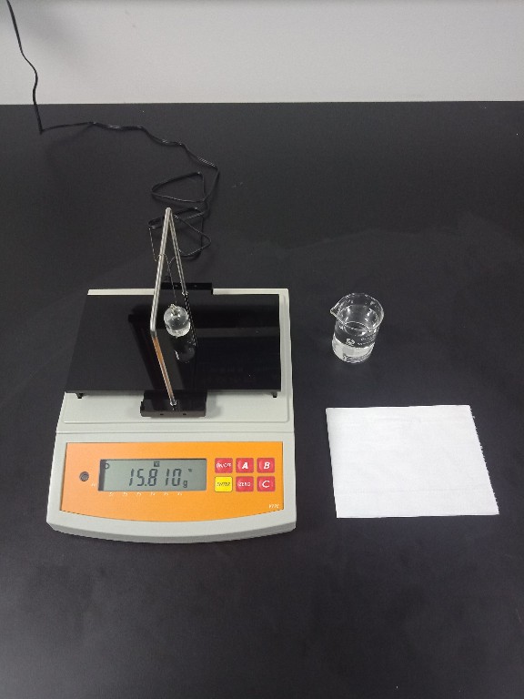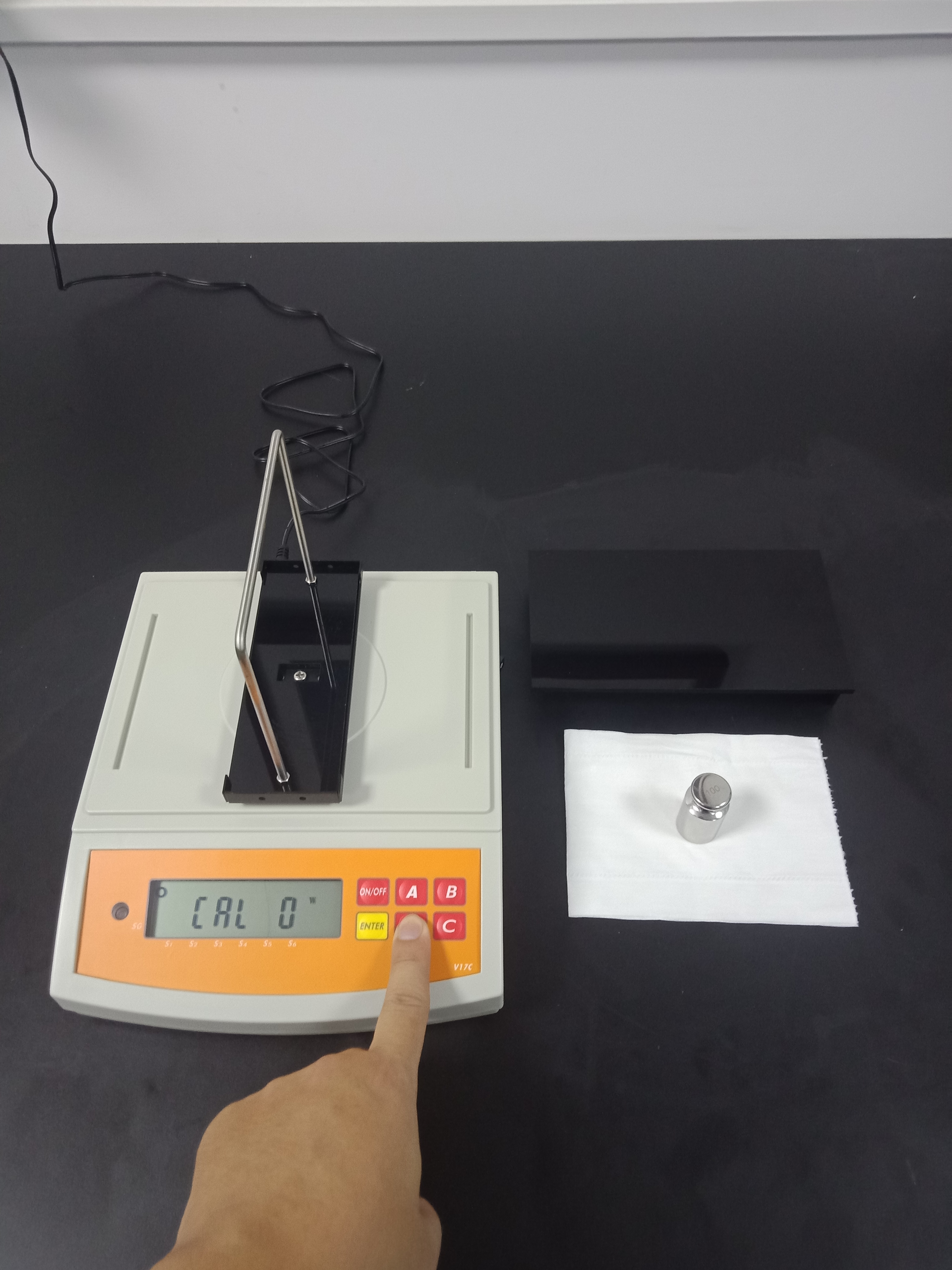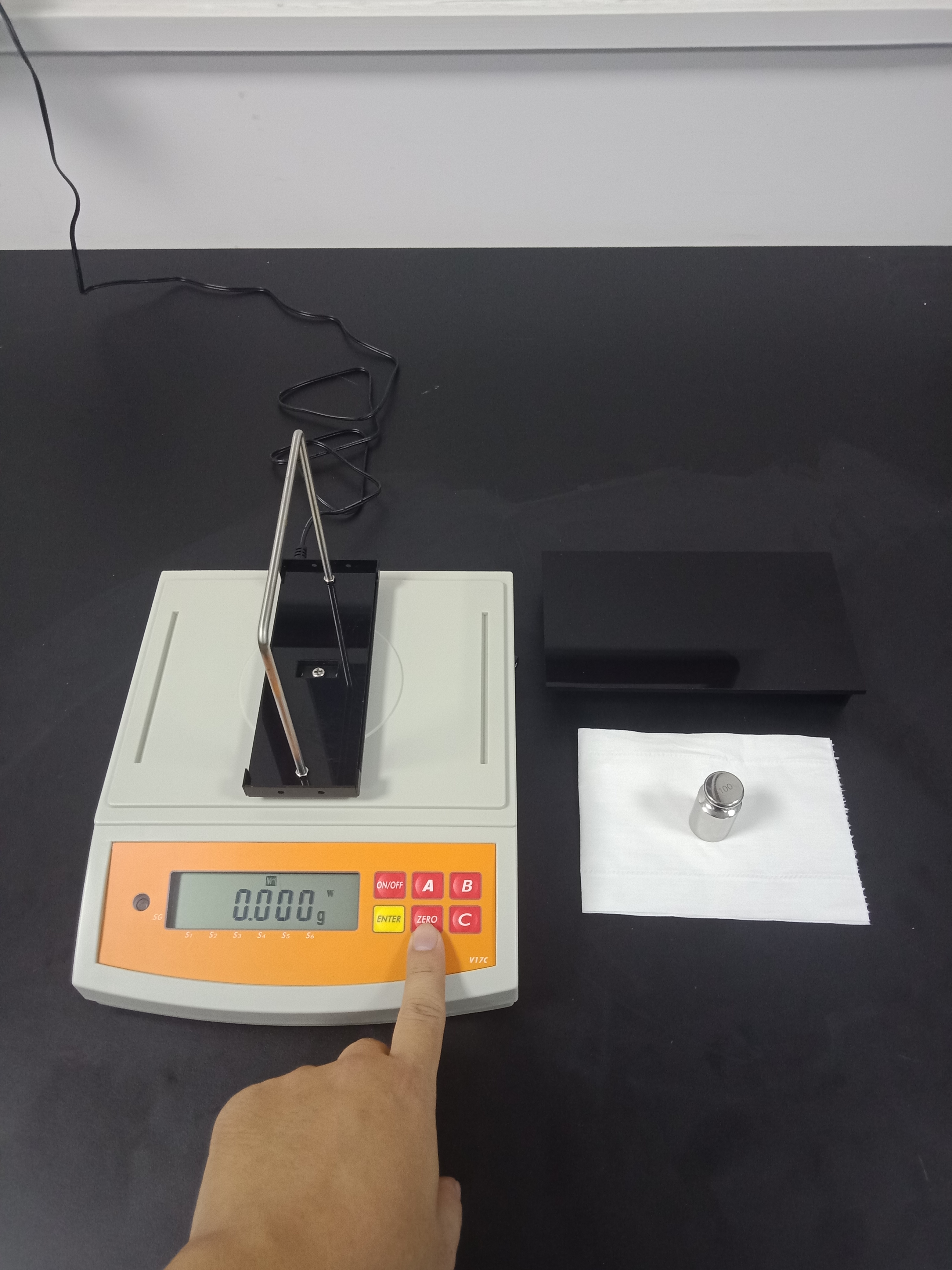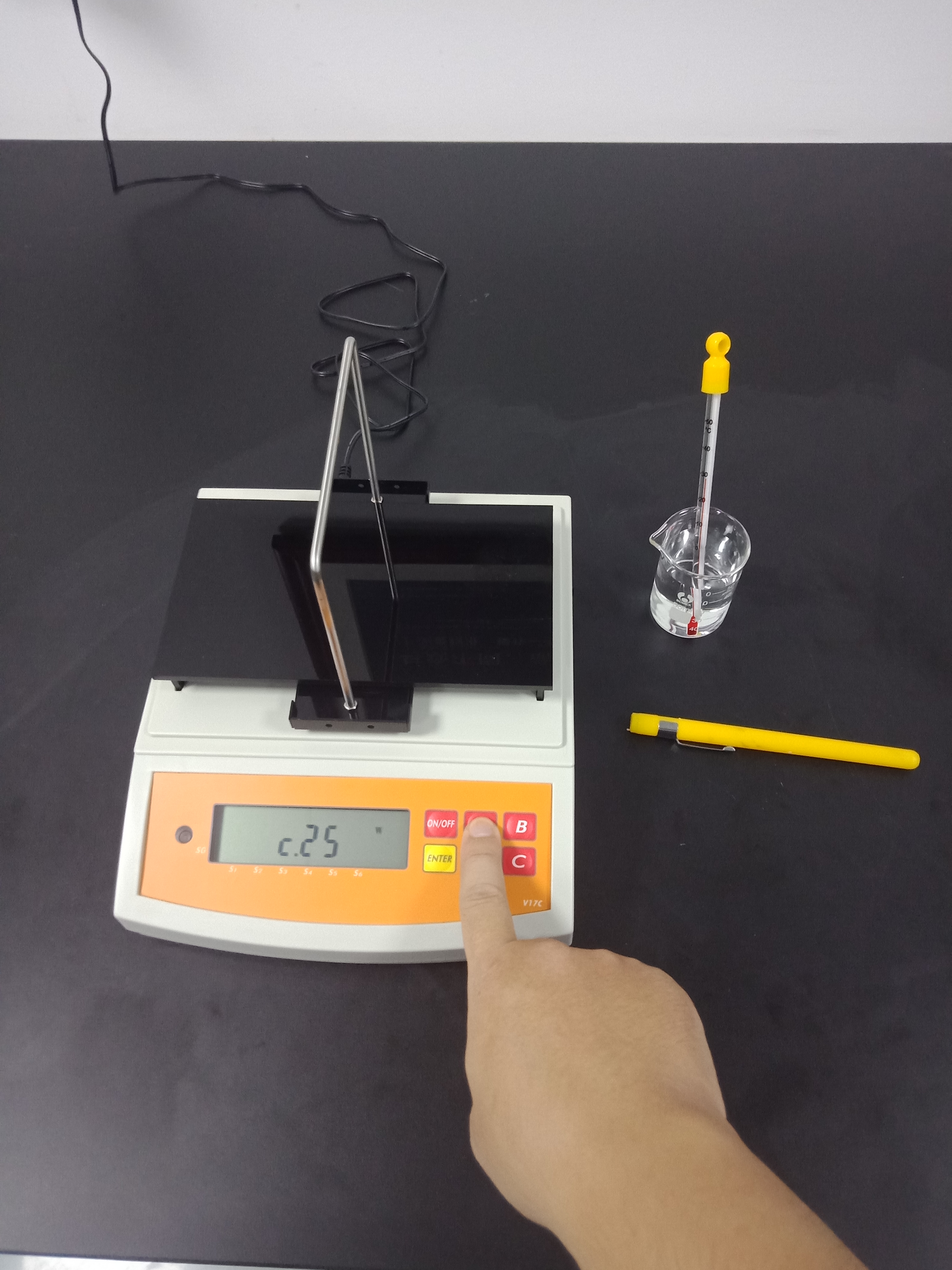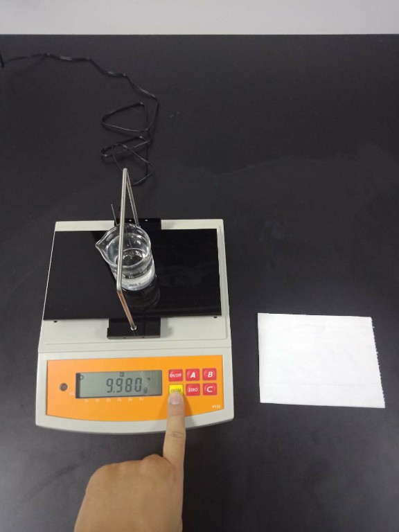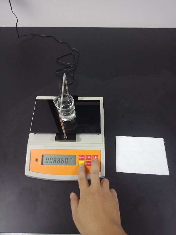 3),記錄好測試結果后,再按一次【ENTER】鍵返回待測模式,并將已測液體樣品,掛鉤和測試用砝碼取下,結束此次測試,如下圖