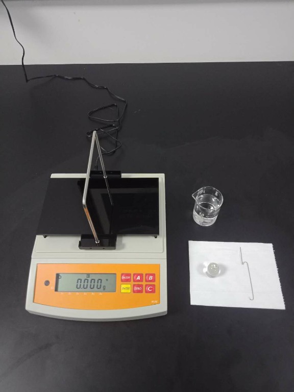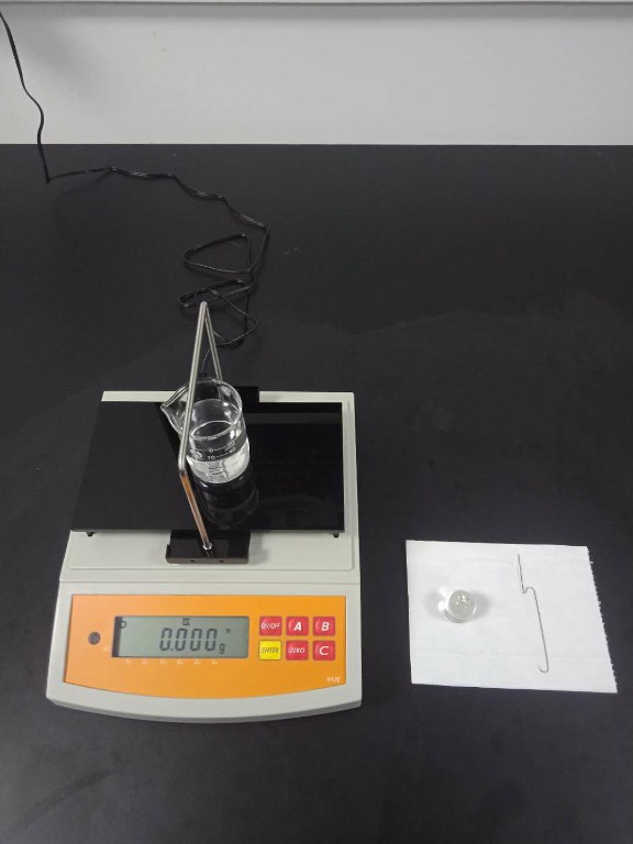 1, 用50ml的燒杯裝50ml的純凈/蒸餾水,準備好測試用的玻璃/不銹鋼砝碼(演示操作中用的是玻璃砝碼)和掛鉤一個,如下圖: