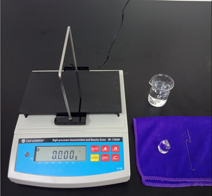 1,準備一杯50ml常溫的純凈水,測試用玻璃砝碼一個,掛鉤一個;