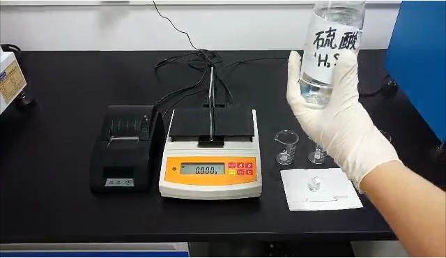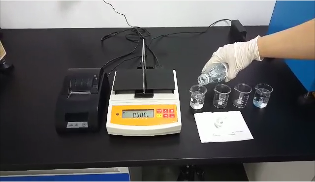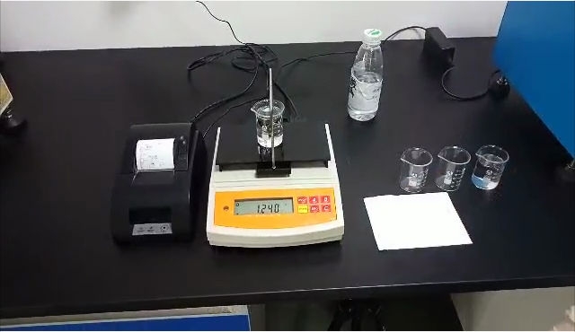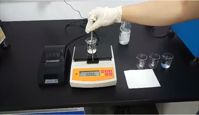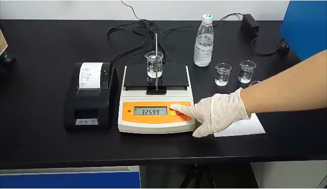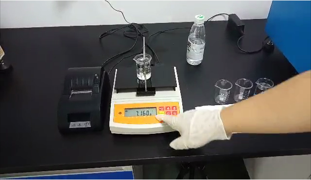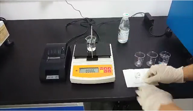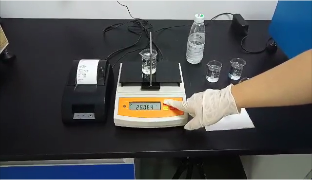 3,用掛鉤勾住測試用標準砝碼后,再將掛鉤垂吊在測試樣品的正上方,測試用標準砝碼浸沒在樣品里;
