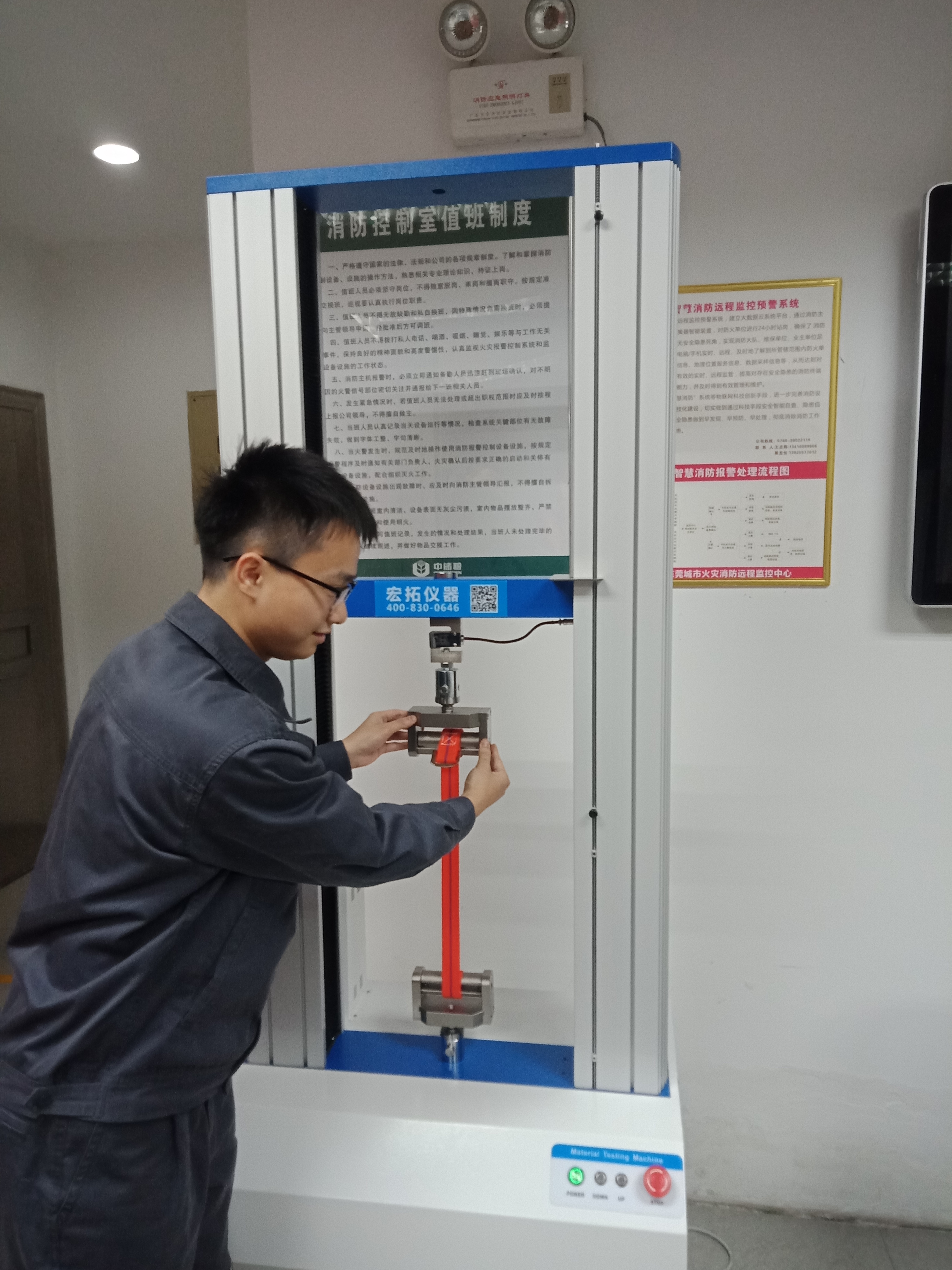 近日,這臺AR-140SC-5雙柱型拉力試驗機已交付中儲糧油脂工業東莞有限公司使用,在送貨后,宏拓儀器的現場教學人員在客戶實驗室現場教學,細心指導客戶實驗室工作人員操作使用AR-140SC-5雙柱型拉力試驗機對高空作業安全帶樣品進行力學測試,客戶對東莞宏拓儀器細心周到的售后服務表示贊同。