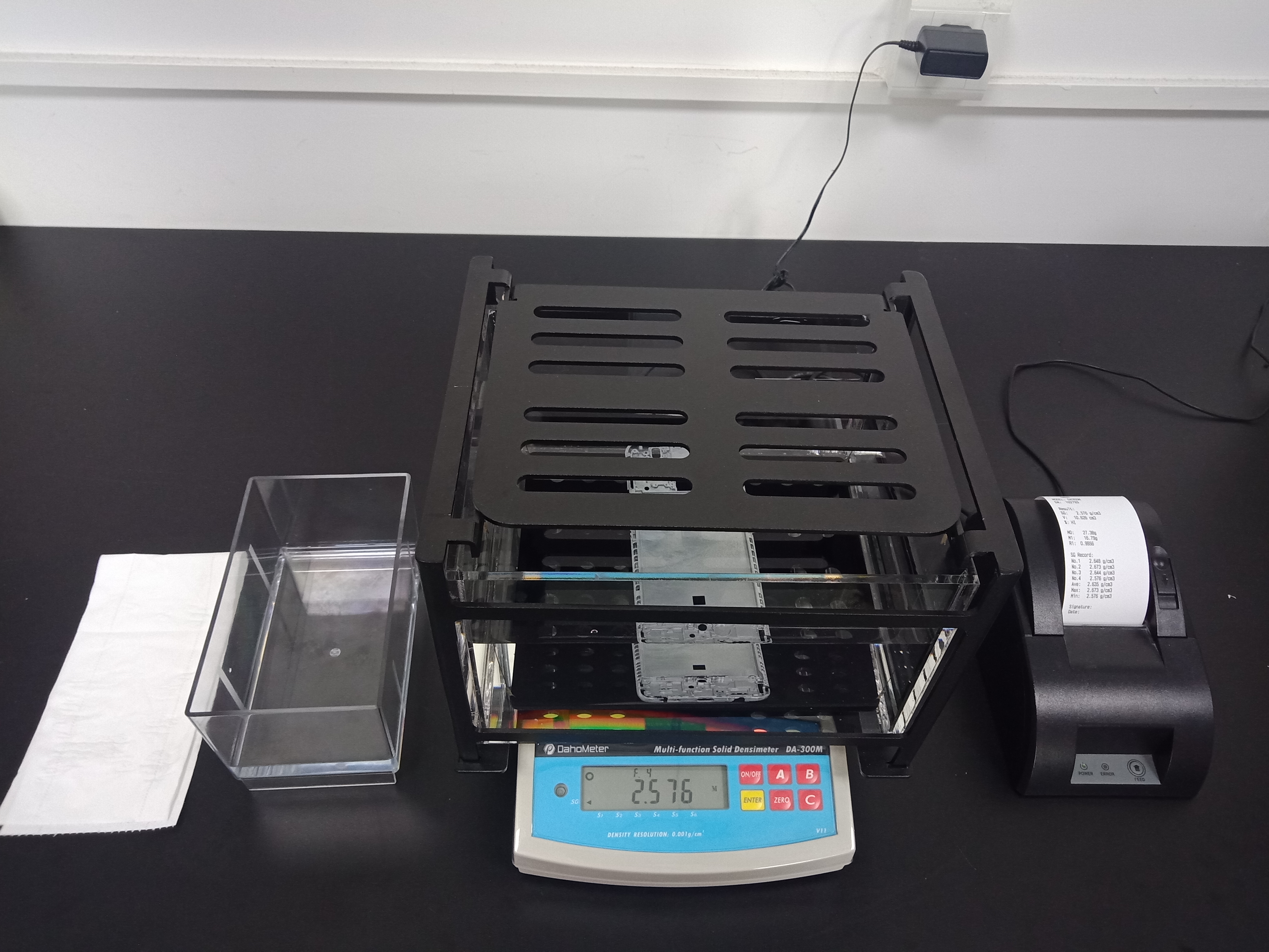 第二步:將測(cè)試樣品放入水中吊籃上的抗浮架下方(如圖3),待重量穩(wěn)定后,按ENTER鍵,儀器記錄重量數(shù)據(jù),數(shù)據(jù)記錄完成后,儀器會(huì)自動(dòng)計(jì)算樣品的密度值,并將計(jì)算出來(lái)的密度值結(jié)果顯示在屏幕上,并可用打印機(jī)打印出來(lái),如圖4顯示,此樣品的密度值是:2.576g/cm3。