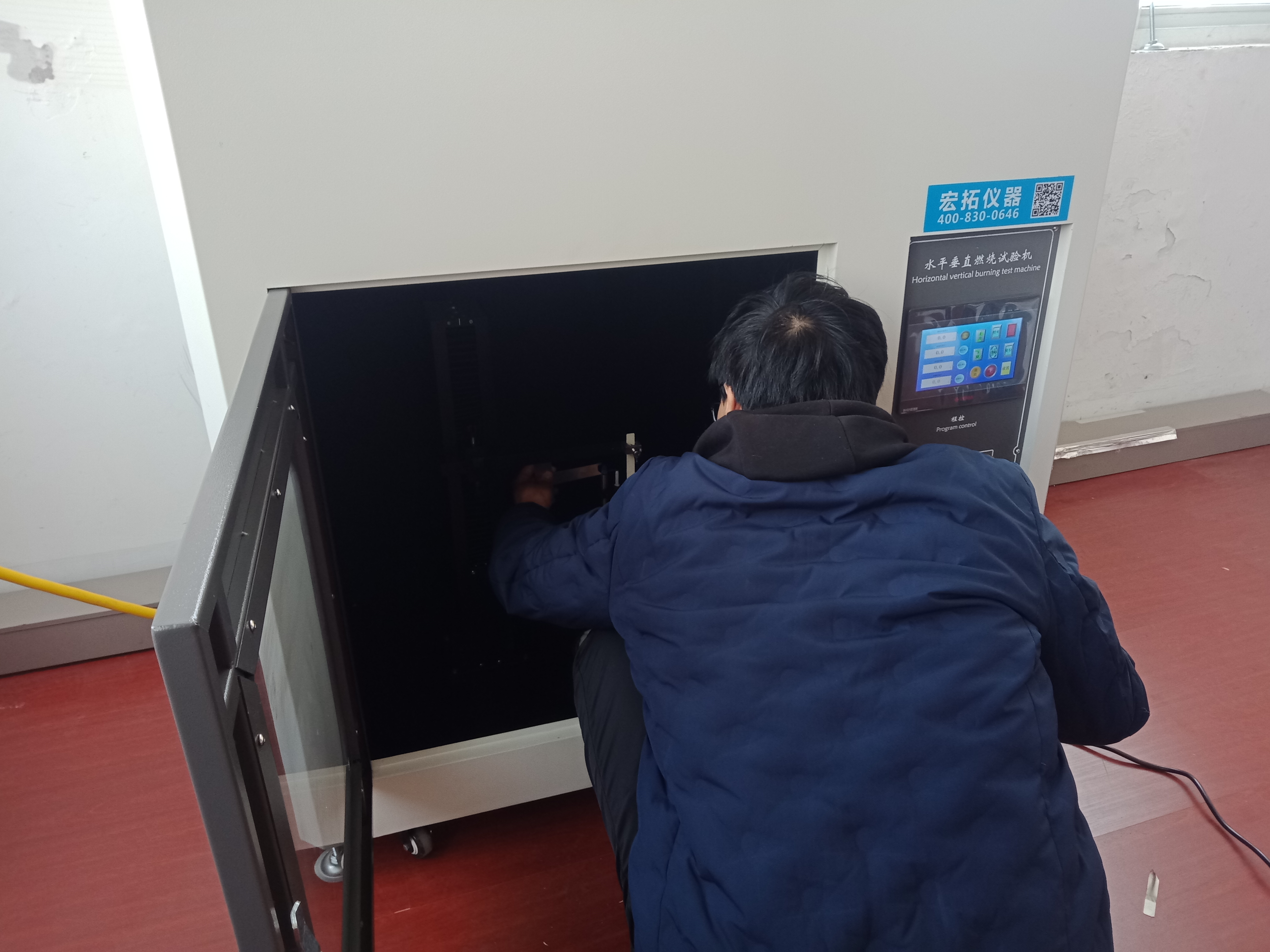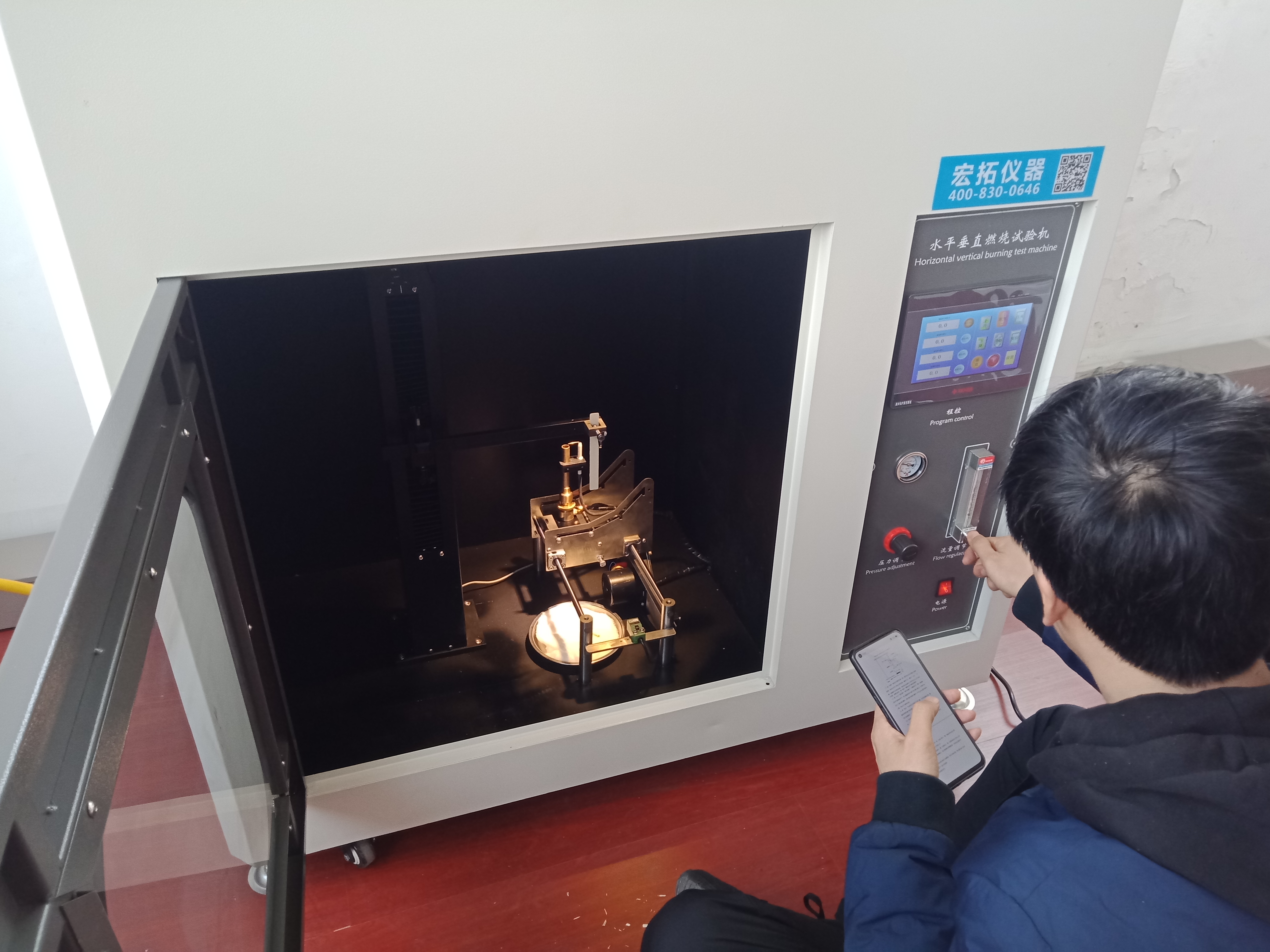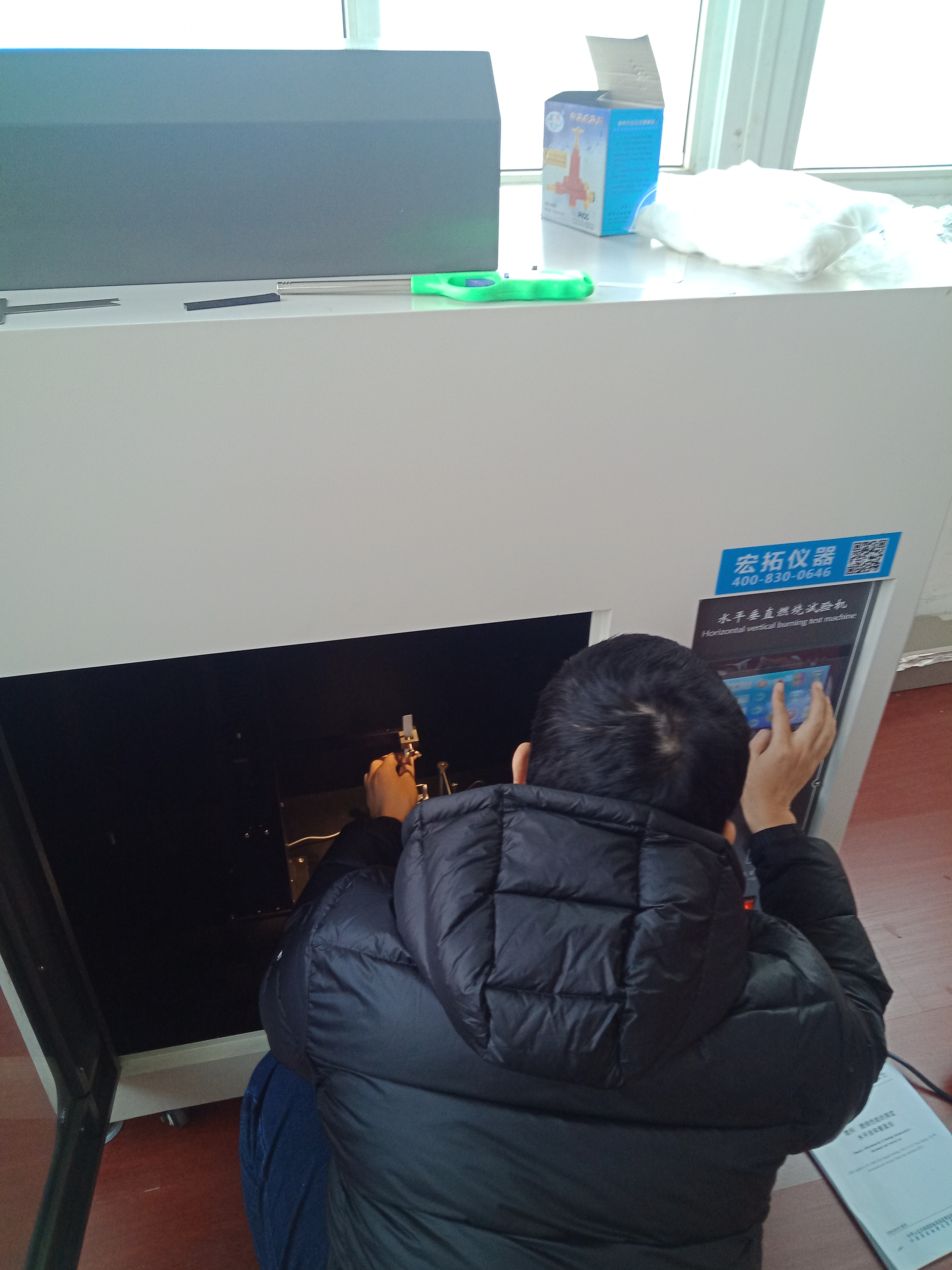 寧波聚嘉實驗室工作人員正在用水平垂直燃燒試驗機進行樣品阻燃測試