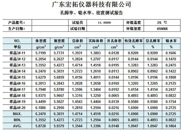 3、將樣品放入水中,待穩(wěn)定后,按鍵一下,數(shù)據(jù)也自動輸入孔隙率測試表。在孔隙率測試表格中查看結(jié)果。