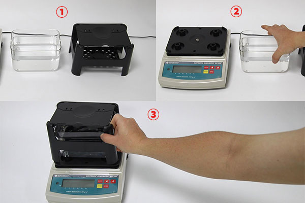 2、將加好水的水槽放到密度測試儀主機(jī)上,水槽的四個圓腳要放入主機(jī)上的四個圓形固定槽中。