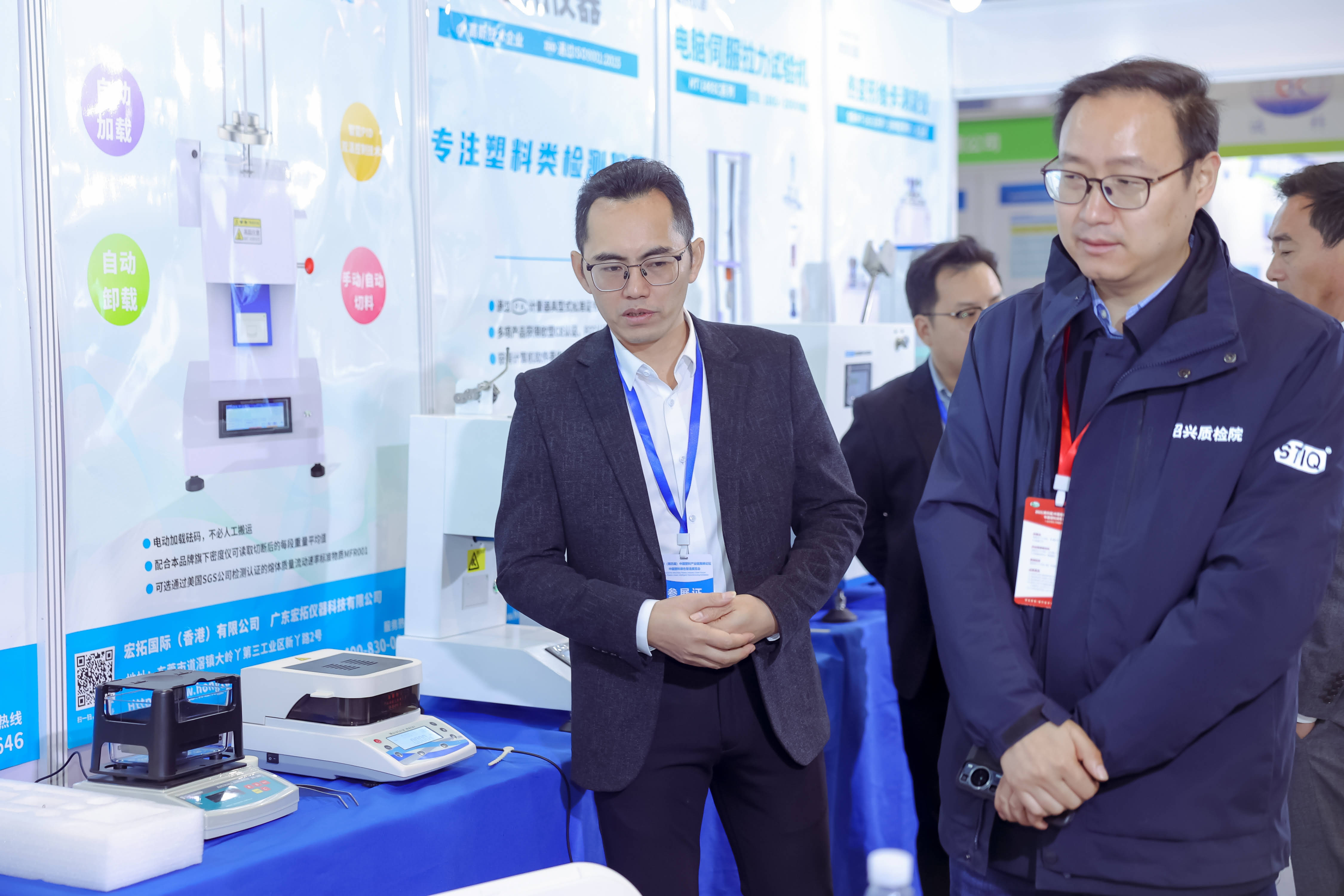參觀展會的游客在宏拓展位上咨詢和參觀各類塑料檢測儀器
