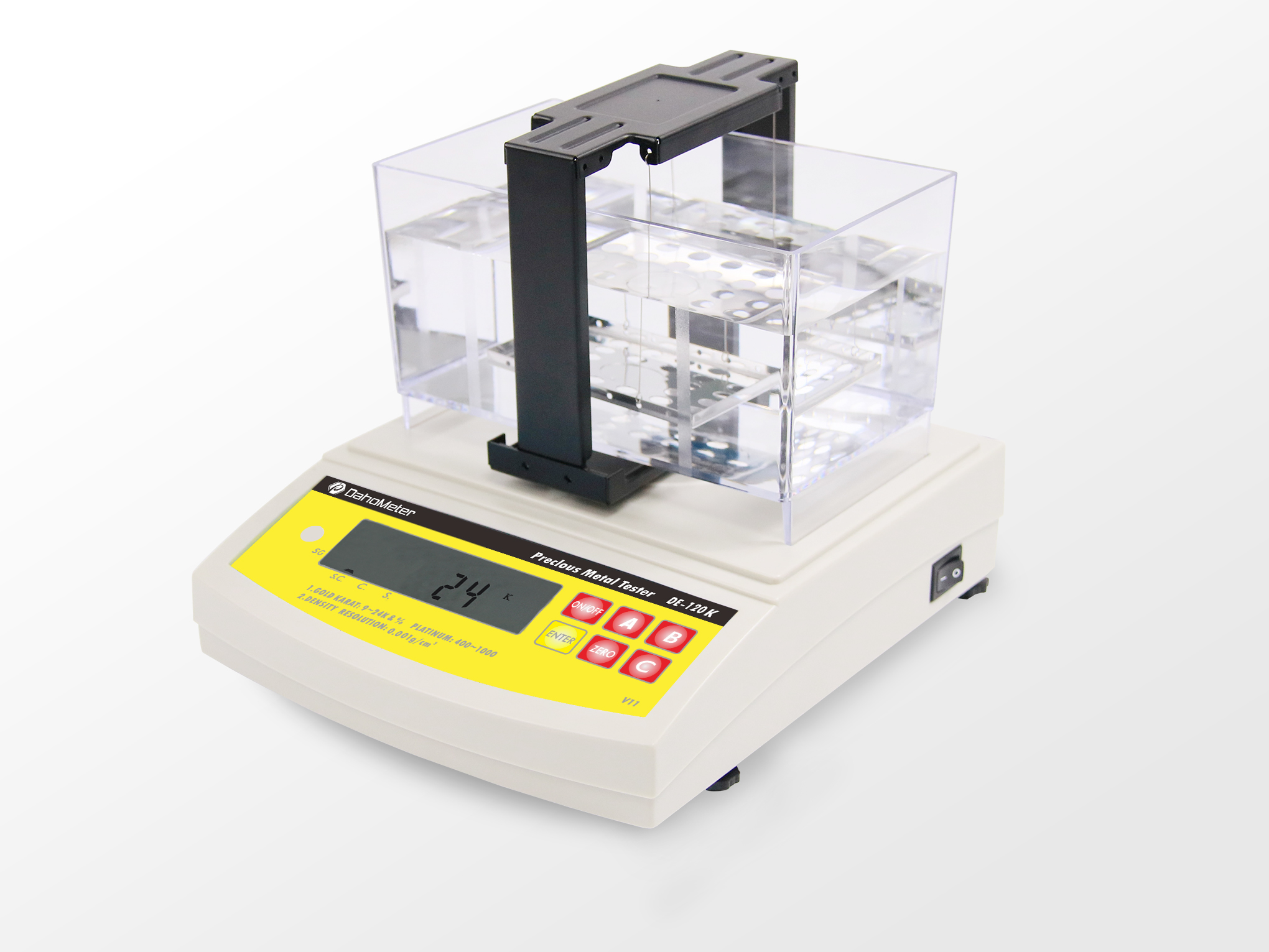 數顯直讀黃金純度測試儀DE-120K是業界采用較為廣泛的貴金屬純度檢測儀器,不損壞樣品、能快速、簡單、準確的區別與檢測黃金的K數、鉑金PT值、其它貴金屬純度%、及密度值。